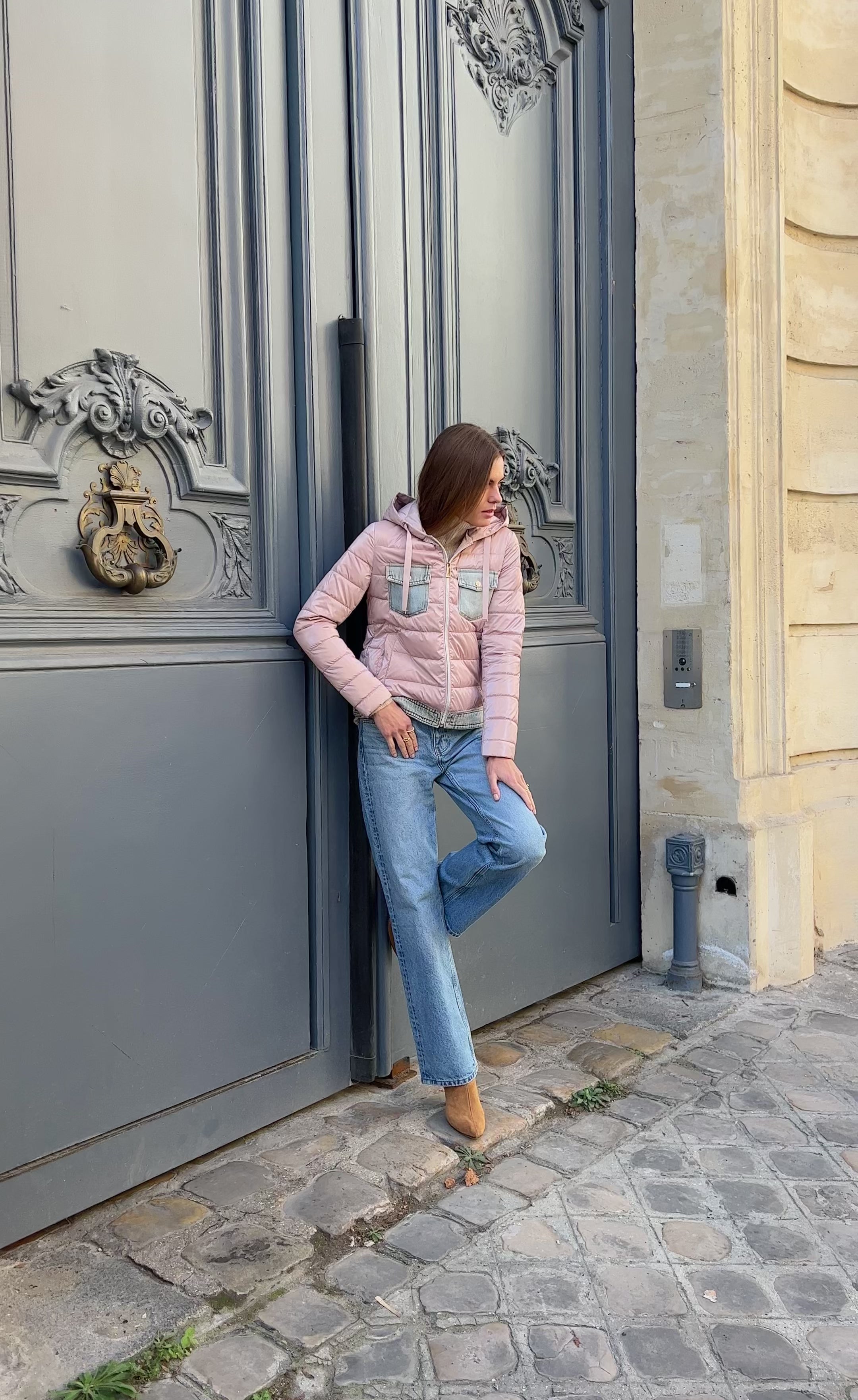 Doudoune bi-matière avec capuche, dotée de poches pratiques et de détails en jean pour une touche contemporaine.
